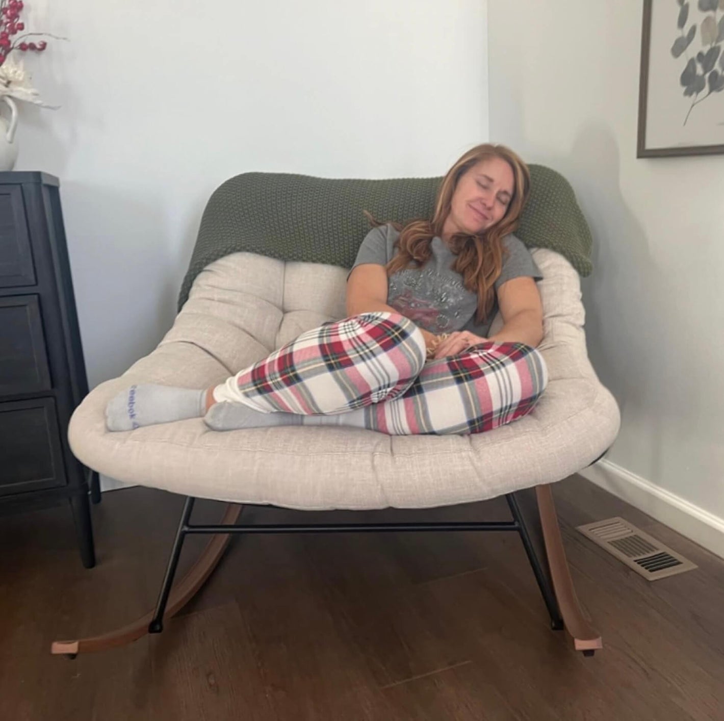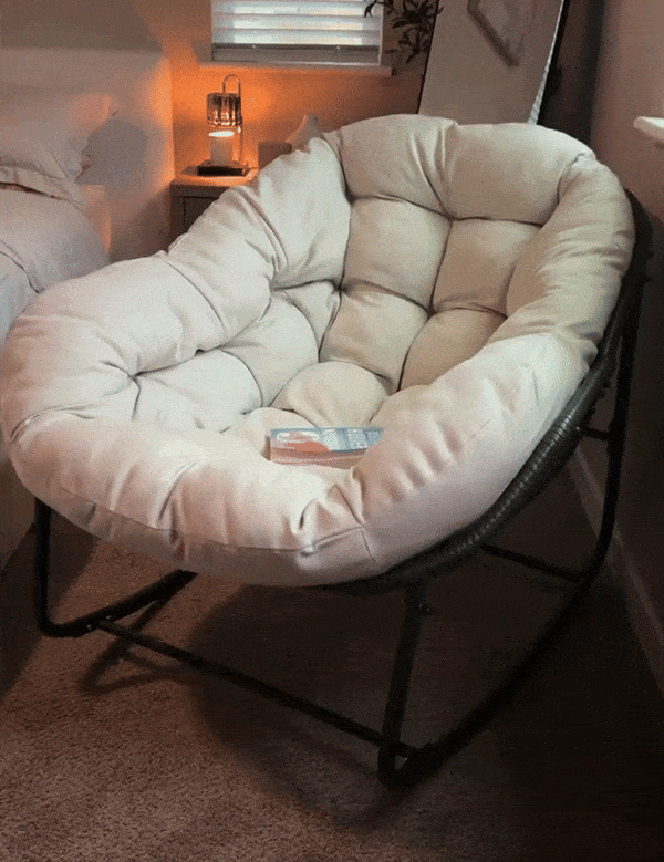 Settle into the oversized cushion and let the gentle rocking motion melt away your stress.